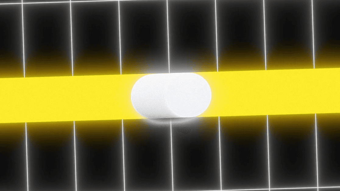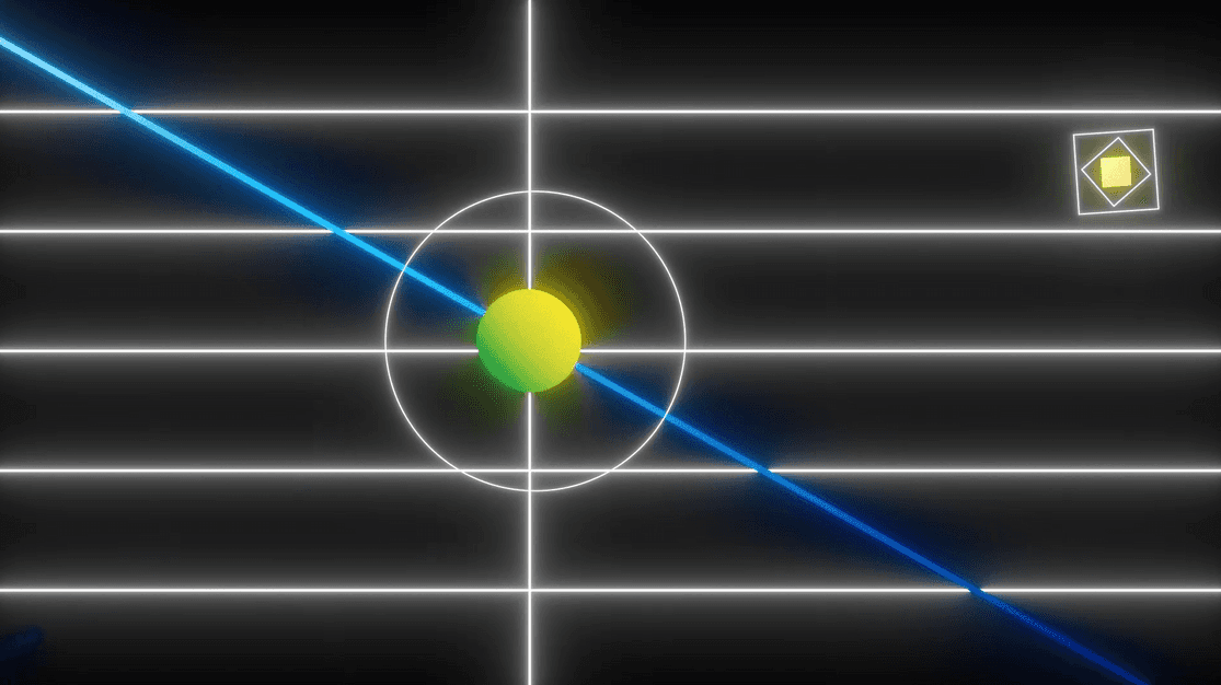 High-energy abstract animation featuring blue and yellow shapes racing and colliding along a white grid structure. Fast motion, sharp transitions, and rhythmic movement emphasize speed, structure, and visual impact.